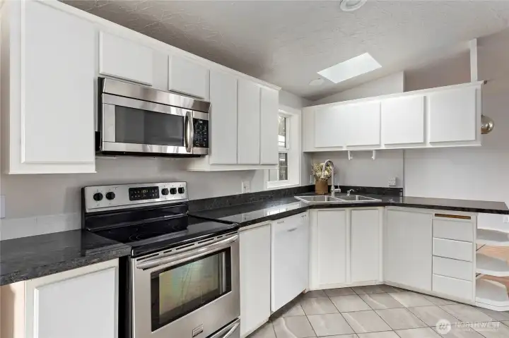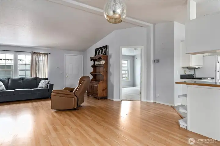 Welcome to this beautifully maintained 3-bed, 2-bath home, featuring a large living room, with impressive vaulted ceilings, located in this lovely 55+ community. The modern kitchen is complete with built-ins, a skylight, panty, and casual dining space, alongside a formal dining room with built-ins. The spacious primary bedroom offers a spa-retreat feel with both shower and soaking tub. Enjoy the convenance of separated bedrooms, and laundry room, in this well thought out floor plan. Other features, energy efficient vinyl windows, skylights, laminate floors, welcoming wood deck, fenced back yard for privacy, storage shed, With ample parking for two vehicle. Welcome home!