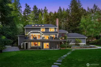 Impressive updates! Stunning estate style home on a sunny 1+ acre backyard oasis! Inviting living room has vaulted ceilings & wall of windows. Elegant dining room. Remodeled Chef’s kitchen offers dual ovens, warming drawer, large island & built-in buffet. Family Rm flows seamlessly to entertaining deck. Main floor office. Sumptuous primary suite has new renovated bath. Fabulous bonus rm! Lower level has full guest suite w/exceptional versatility: Kitchen, large bonus, Bdrm, bath, exercise rm & hidden storage. Separate entry is a perfect guest suite/entertaining area. Sunny backyard offers multiple decks, covered patio, huge level lawn, gazebo w/waterfall, hot tub, potting shed & more. Sought after Cherry Crest Elem. Home on sewer-No septic!