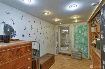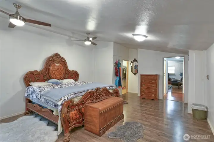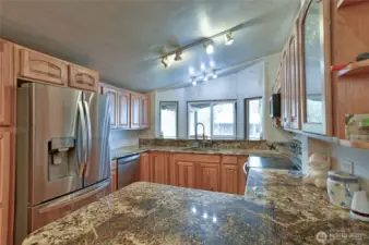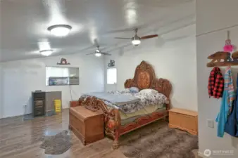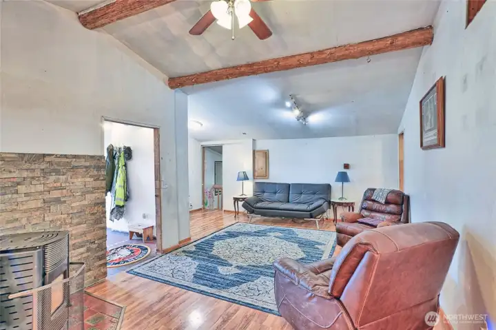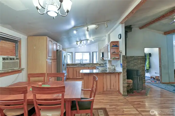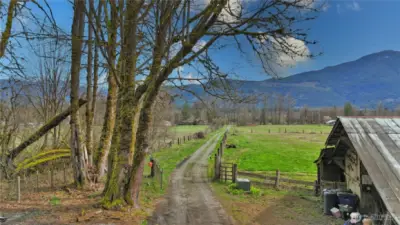 Comfortable, private home on 10+ acres nestled against over 50 mi.² of national Forest and a creek. Space for riding hiking and hunting. Fenced and cross fenced. Flat pastures. 5 miles to town walking distance to casino, dining,store and rec center in progress. 2 rustic barns, tool shed, 2 RV spaces with 30 and 50 amp power. 1 is enclosed and paved with a mechanic pit. 1 is uncovered with full hook ups and laundry building. Additional covered parking/storage. RV rental income potential. Layout provides possible second family room. Granite in kitchen, tile bathrooms, laundry, and foyer. Large rain shower. Appliances less than one year old. Covered porch to sit and admire the beautiful Mountain View.