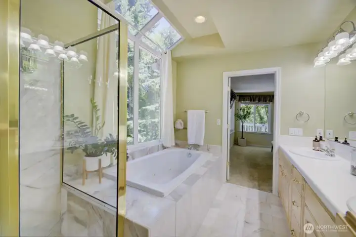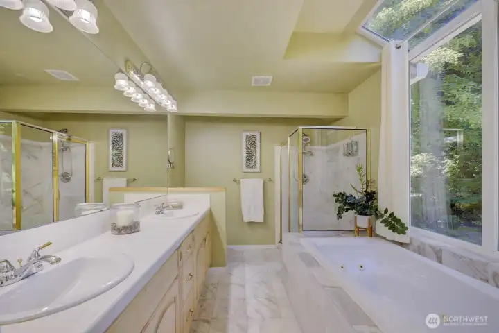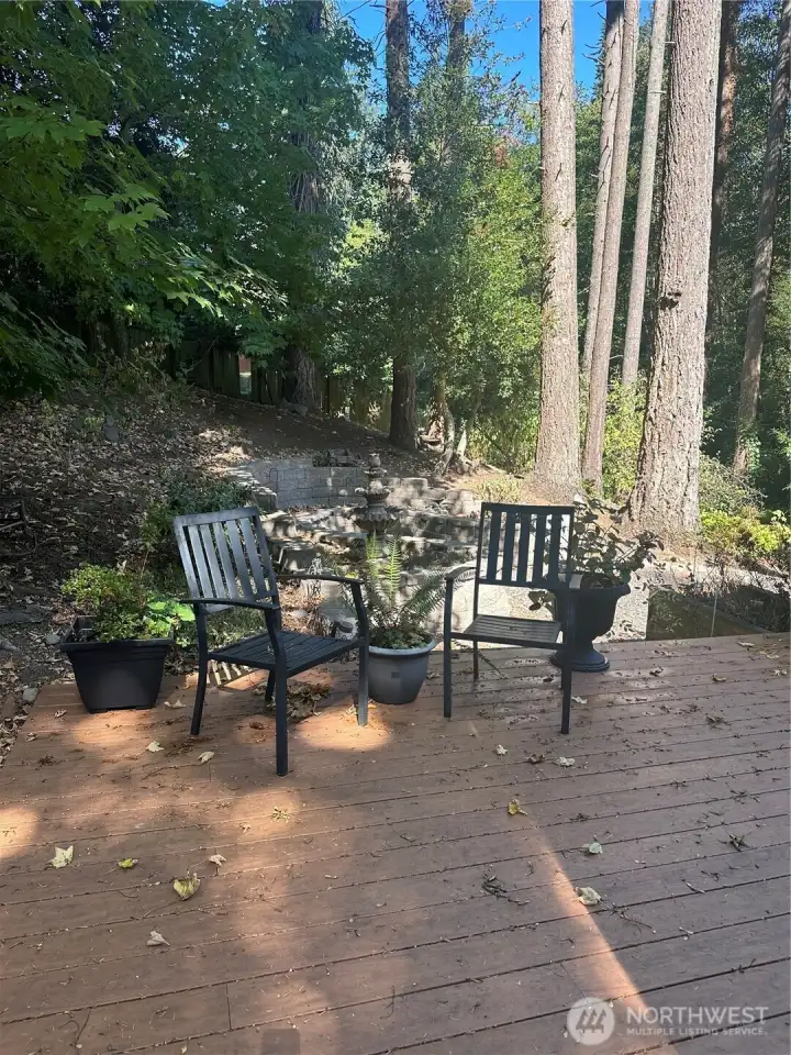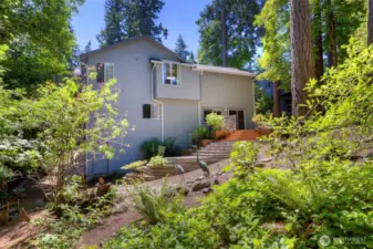 This tranquil private house is nestled in Northwest Nature. Live among the trees, wildlife and gardens. Enter into a bright, airy ambiance in vaulted living room with gas fireplace. Dining room opens off the kitchen with access to a viewing deck. Kitchen looks out to territorial view. Newer fridge and gas stove. Primary suite is a serene retreat with a sitting deck for morning coffee and a 5-piece Spa-inspired marble bathroom. Downstairs includes 3 bd, 1 full bath. Expansive family room with fireplace. Off the family room is a kitchenette. Perfect for adding an ADU/ Guest Suite. Outdoor landscaping includes terraced areas, water fountain and gathering area. Close to Parks, New Transit Station, Schools. Desirable location. Welcome Home!