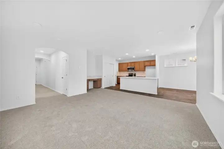 The 1743 square foot Middleton combines luxury and space in a two-story home plan. The first floor features an expansive living room and adjoining dining room, both overlooked by an open kitchen that offers ample counter space, cupboard storage and a pantry. Upstairs, the extravagant main suite boasts a luxurious dual vanity bathroom with a private water closet and shower, as well as an enormous closet. The two other sizable bedrooms, each with generous closet space, share a large private bathroom and complete this well-rounded home.