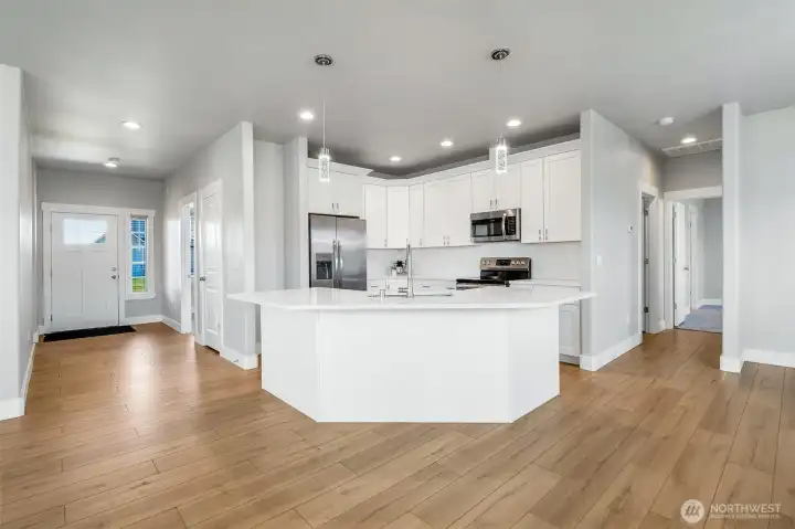 Beautifully designed 3 bedroom, 2 bathroom home offering 1674 sq ft of bright, open living space on generous 9000 sq ft lot. Built in 2022, this single level home blends modern finishes with functional design. The kitchen features sleek quartz counters, white cabinetry, a huge island with seating, and stainless steel appliances. The primary suite includes a huge walk-in closet, dual sinks, fully tiled shower and separate soaker tub. Additional upgrades include custom blinds, landscaped yard with underground sprinklers, backyard shed for hobbies or additional storage, insulated and painted garage, and all appliances are included. Centrally located and move-in ready, just unpack and start enjoying your new home!