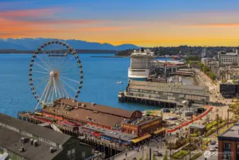 Elevated two-level waterfront living at Waterfront Place! Expansive views unfold across Elliott Bay, the Sound, mountains, and skyline — with extraordinary sunsets defining the horizon. A landscaped garden courtyard creates a welcoming arrival. Inside, 10-foot ceilings and walls of glass frame water, mountains, and sky, filling the living and dining spaces with light. Generous rooms are thoughtfully scaled and anchored by a wood-burning fireplace. The primary suite is serene and elevated, capturing wide-open vistas across the Sound. A flexible den adapts effortlessly for office or retreat. Three terraces extend the living experience outward — seamless indoor-outdoor living above the city. A boutique building with secure garage parking, moments from Pike Place Market and Seattle’s iconic Waterfront Park. Water, sky, and city — in constant view.