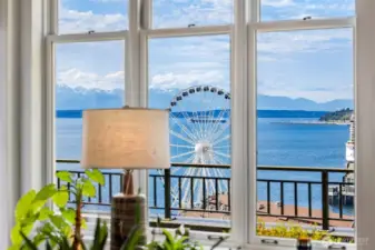 Welcome to a sparkling two-level jewel box at Waterfront Place! This penthouse-like residence lives like a home, w/ sweeping views in all directions—Elliott Bay, Puget Sound, the mountains & city skyline—framed by unparalleled golden sunsets! A lush garden courtyard offers a serene welcome. Inside, light-filled spaces feature 10-foot ceilings, a dramatic living & dining area & a wood-burning fireplace. The stunning primary suite & flexible den/office boast breathtaking views & versatility. Three-view terraces create magical spaces for entertaining or a zen retreat. A secure, boutique building w/ garage parking—steps to the Pike Place Market, celebrated dining & Seattle’s new 20-acre Waterfront Park, where nature, art & community converge!