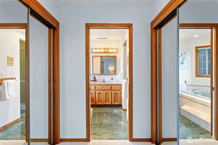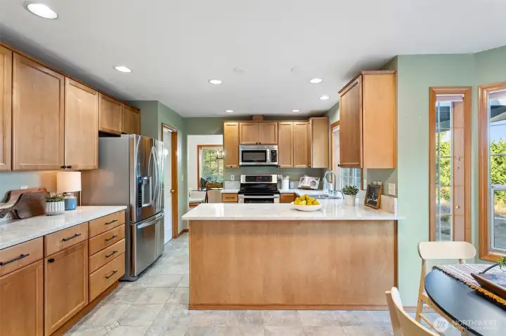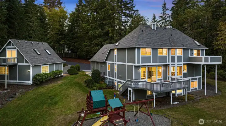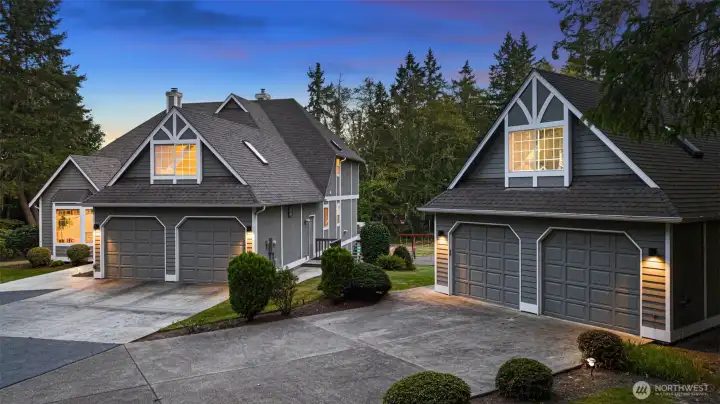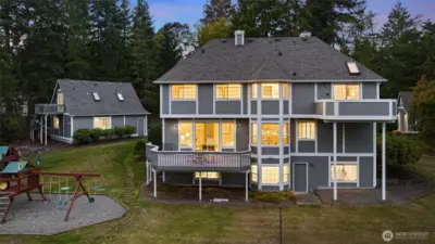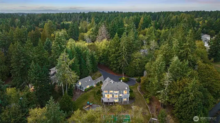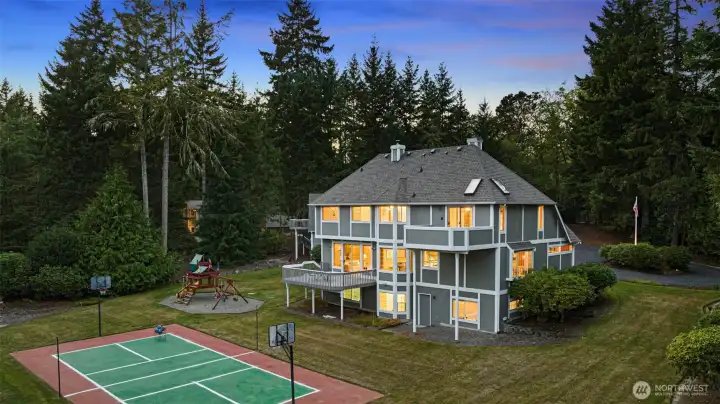Wake every morning to the majestic, perfectly framed silhouette of Mt. Rainier-venture out onto one of your south facing decks and breathe in the salt-air. Custom-crafted and impeccably maintained home invites an array of living options on every level. Stunning primary suite affords a commanding view of the grounds & a slice of water in the distance. Second kitchen + separate entrance seamless hosting for long or short term guests. Outside, evenings stretch around the fire pit as spirited games unfold on the sports court. Relax & unwind, as you meander home to the 5+ bays of storage for cars, boats, or toys- set apart & serene.