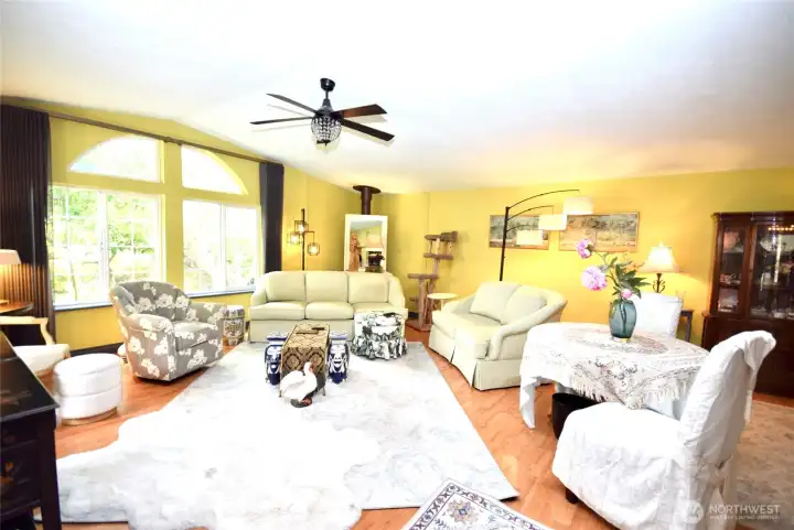 Gardeners dream come true. This property has incredible tranquil yard spaces, fruit orchard, picnic area, shed, large lawn area and much more. This beautiful home is a triple wide with 3 bedrooms, 2 baths & 1/2 bath. Breezeway to 1200 soft garage that holds 2 cars, workbenches & mower/cycle door. Attached is a finished shop that was a beauty shop & could be a business or amazing shop or sewing room or whatever you envision. This room has heat & a half bath.