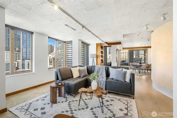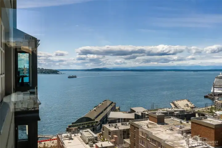 Some terraces just check a box—this one steals the show. A rare west-facing studio with an expansive, wraparound deck complete with water, power, and dreamy views. Slide open either set of doors and step into your private sky lounge, where the views of Elliott Bay, the Olympics, and Seattle’s waterfront are breathtaking both day and night. Inside, floor-to-ceiling windows, A/C, in-unit laundry, clever built-ins, and a sleek European-style bath. All in a coveted concrete-and-steel building just steps from Pike Place Market. Parking and storage included. City living, elevated.