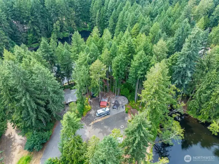 LAKE VIEW parcel with direct access to Blue Lake inside the Clearwood Community. Beautifully landscaped w/retaining walls & a concrete block firepit. A 12' x 16' outbuilding will house your toys Your own private covered hot tub & infrared sauna can be enjoyed year 'round or cozy up under the gazebo for the most serene views of Blue Lake and the tall firs. Power & water are on the property as well as 30 amp hook up for RV up to 24". With 120' of low bank lake access, this lot is perfect for kayaking, paddle boarding or paddle boat! 14 miles of walking trails takes you around Blue Lake & Clear Lake. Explore the any of the 6 swimming beaches, parks, pickleball courts, or swimming pool/hot tub! Convenient camp bathrooms on cul de sac.