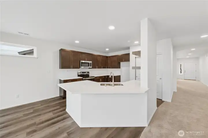 The 1574 square foot Hudson is an efficiently-designed, mid-sized single level home offering both space and comfort. The open kitchen is a chef’s dream, with counter space galore, plenty of cupboard storage and a breakfast bar. The expansive living room and adjoining dining area complete this eating and entertainment space. The spacious and private main suite boasts a dual vanity bathroom, optional separate shower and an enormous closet. The other two sizeable bedrooms, one of which may be converted into a den or office, share the second bathroom and round out this well-planned home.