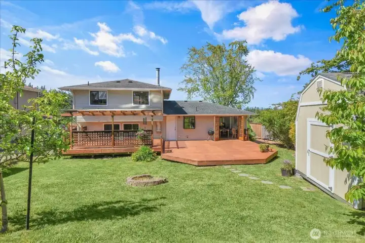 Stunning home with breathtaking Territorial, Mountain & Sunset views with a glimpse of Puget Sound; Bright & open floor plan; new carpet & interior paint; spacious formal living & dining rooms with a large bay view window that fills the space with natural light; the granite countertop kitchen opens to a cozy family room with wood stove & access to laundry & half bath; upper level has 3 bedrooms, full bath, plus a private 3/4 bath off the primary suite featuring dual closets; the beautifully landscaped fenced backyard is a private oasis ideal for entertaining on the partially covered 900 sq ft deck. Spacious 2-car garage; near all amenities, Lighthouse, Ferry, Boeing & I5; Excellent Schools; No HOA, MOVE-IN READY! Desirable neighborhood.