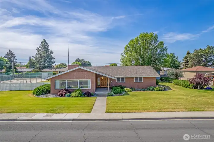 Fantastic property admired by all. Brick home, 2,568 sq ft with 4 bedrooms, 3 baths, huge living room with large picture windows and a gorgeous rock fireplace. Work from home in an office featuring built-in beautifully stained drawers and shelving to keep you organized and sliding glass doors to the covered patio to comfortably relax outdoors. The kitchen takes full advantage of the sunshine with large windows and slider to the covered patio. Corian counter tops and island seating, double ovens, beautiful cabinets and a walk-in pantry ready for you to decide how best to configure it. The primary bedroom suite and 3 additional bedrooms are good-sized. Attached over-sized garage plus 1,088 sq ft garage/shop AND a sport court are all amazing!
