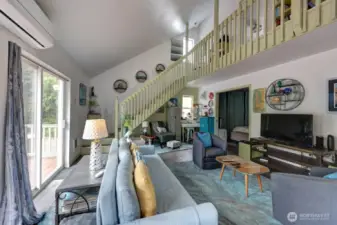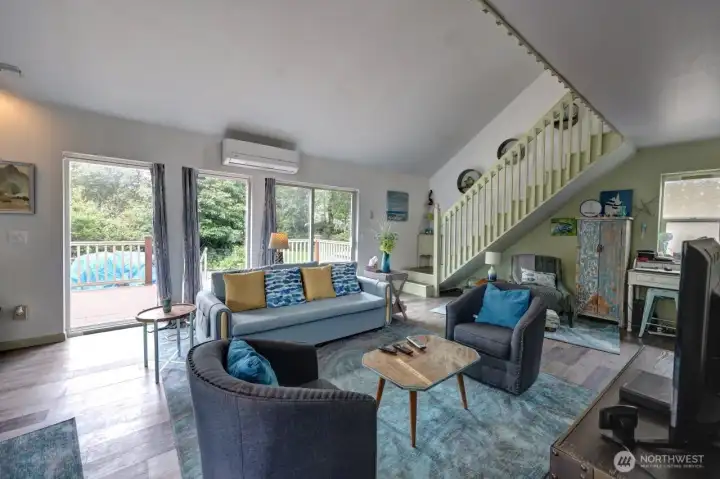 Nestled on a quiet cul-de-sac, this charming 3 bedroom, 2.5 bath home The great room boasts 20 ft ceilings, large windows, ceiling fan and a wood burning stove. A ductless heater/air conditioner ensures year-round comfort. The great room has ample room for dining area and office space. A sliding door leads to a Trex deck with steps to a firepit and low maintenance yard.The kitchen features quartz countertops, all electric stainless-steel appliances. A built in pantry provides additional storage. Behind bifold doors is a washer and dryer Off the great room is the primary suite with private ¾ bath with a walk-in shower. LIFETIME ALUMINUM ROOF!!!! . A New generator is included. ALL FURNITURE INCLUDED!!!