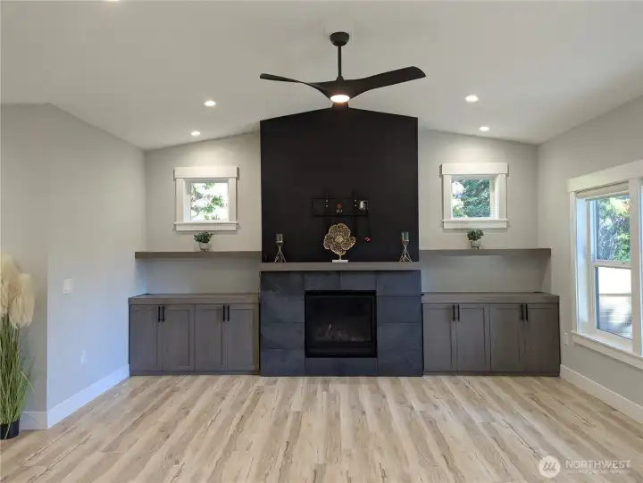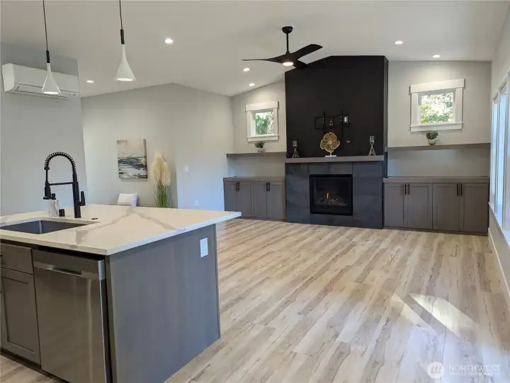 Embrace beachside living in this 2BR, 1.75BTH, 1,266 SF rambler with mid-century modern vibes in Ocean Shores! Spacious layout, featuring luxury vinyl plank flooring, a slate propane fireplace with custom built-in cabinets, quartz counters, soft-close doors & drawers, modern appliances & a large island - perfect for entertaining. Stay comfy year-round with a mini-split heat pump. Step outside to a fully fenced, professionally landscaped backyard with a covered Trex deck & modern railing—ideal for relaxing after a day at the beach. Just down the street from North Bay Park with access to 26 miles of fresh water canals & two lakes. Amenities & activities offered at the Ocean Shores Community Club complete this dreamy seaside escape!