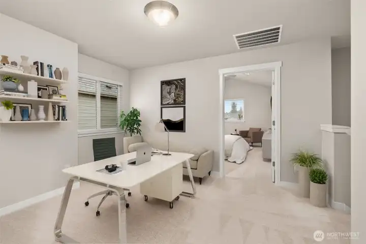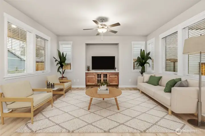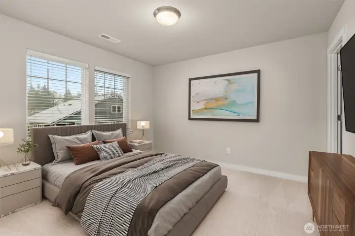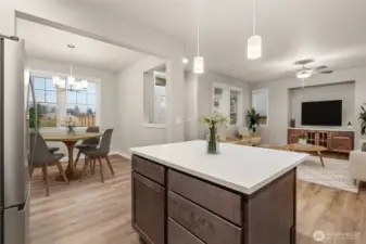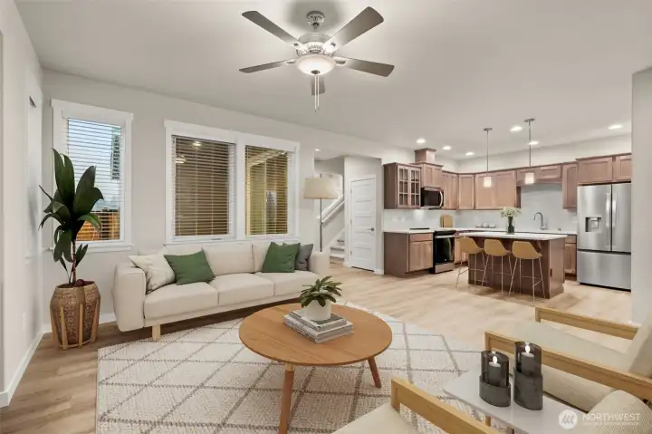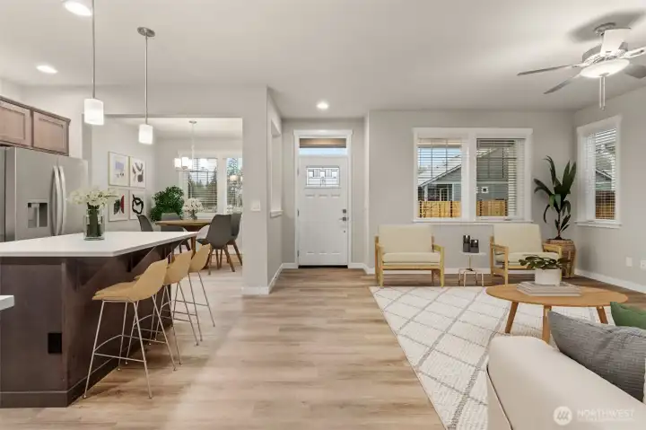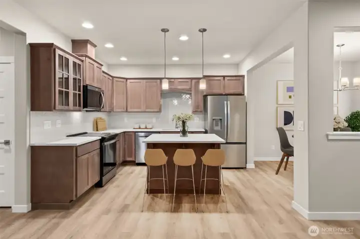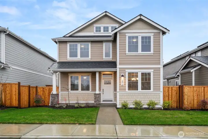 Celebrate the Season with Move-In Ready Comfort! Washer, dryer, refrigerator & blinds now included on all completed homes! Rob Rice Homes Elm Plan offers the ideal easy living experience! The kitchen boasts elegant 'Shadow' Maple cabinets, quartz counters, full tile backsplash & stainless steel appliances-induction range/oven. Seamlessly connects to living room w/built in cabinetry & vinyl plank throughout the main floor. Upstairs, you'll find a loft and all the bedrooms, including a primary suite featuring a walk-in closet and a 5 pc bath with a soaking tub surrounded by tile. Quartz counter tops throughout. Oversized 2-car garage, partially covered side patio, and front yard irrigated & maintained by the HOA. Some photos virtually staged.