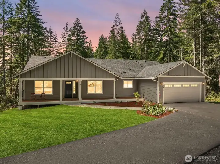 Impeccable newly built 2,128 sq ft rambler on 2+ acres, just 10 min from Gig Harbor & 2 min to the freeway. Sprawling open-concept design with vaulted ceiling & towering stone fireplace all overlooking your personal nature preserve. The primary suite boasts a huge room, walk-in closet, big shower & soaking tub. Two additional bedrooms share a full bath at the opposite end for privacy. Enjoy a lush lawn encircled by towering trees, blacktop driveway & paved parking pad & TONS of room for parking your toys, RVs & guests. Whole home heat pump to keep you toasty warm or ice cold depending on the season. Huge, high ceiling, unfinished basement ready for you to build out an ADU & plenty of room to build your dream shop on the property as well!