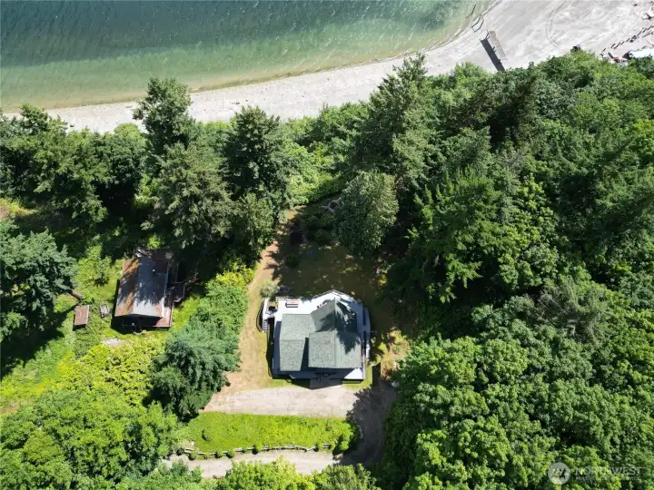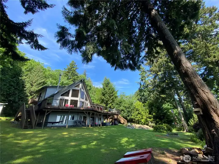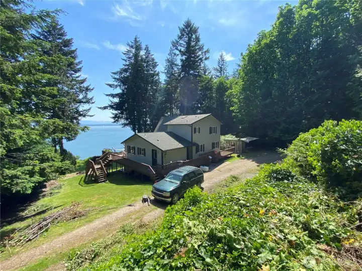 Private Island retreat with Breathtaking Views. Proven Rental Income. Nestled at end of a secluded lane, on nearly one acre with potential to build 2nd View Home or divide & sell. Rare east-facing retreat with soaring windows for sunrise views over the Cascades. Relax, entertain and watch whales on your large, wraparound deck. 3-level, open-concept home with wood-burning stove for cozy evenings. Spacious kitchen and laundry room. Primary suite with views & balcony. Custom bunk room, game room, sleeps 14, tons of storage. Firepit with views. Partially furnished. Ready to enjoy right away. Hat Island boasts 9-hole USGA Golf Course, 6-day/week private ferry, community garden, beaches, eagles, whales, crabbing, fishing, so much more.