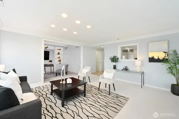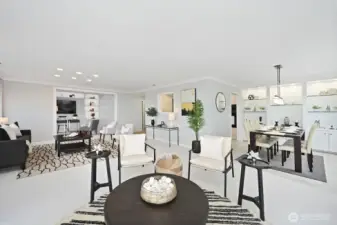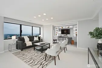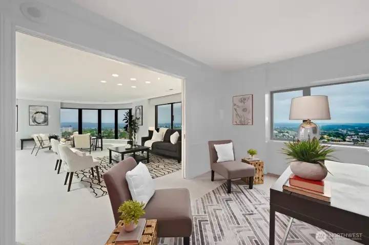 Urban Luxury awaits in this meticulous 2 br/2 ba, 1480sf condo located on the SE corner of the 28th floor. Featuring floor-to-ceiling windows with panoramic views of Mt. Rainier, Lk Washington & the Bellevue skyline. Primary suite is loaded w/ closets & walk-in shower. 2nd br is staged as office/media room. Add sofa bed or murphy bed to welcome guests. Pocket door closes for privacy. Fabulous kitchen w/ new cooktop & SUB-ZERO frig opens to large DR w/ built in storage & shelving for displaying your possessions. Stacked W/D, storage unit, & 2 parking are included. FHP is noted for its top tier amenities: 24/7 concierge, tennis/pickleball court, indoor rooftop pool, gym, hospitality & guest suites, outdoor jacuzzi & refreshed courtyard.