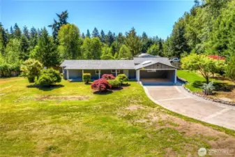 Beautifully secluded & previously fully remodeled home on nearly 3 acres! Upgraded w/ new wiring, plumbing, insulation, flooring, paint, fixtures, & more. The large kitchen features a stunning butcher block island, a farmhouse sink, & new tile. Enjoy the vaulted ceilings in the living room, complemented by a cozy pellet stove. The bathrooms updated w/ modern vanity, and laminate flooring. Step outside to a covered front patio w/ a spacious carport, perfect for outdoor living. Potential to subdivide the property, creating more investment opportunities. Home previously moved on property making financing difficult. Possible financing available for qualified buyers w/ a 750+ CS & 30% down (see agent). One Year Home Warranty to be provided.