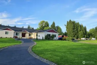 Oasis in the City! Meticulously maintained Luxurious 4bed/3bath Vaulted Open Concept home. Featuring Dual-YES 2 primary bedrooms w/walk in closets, private baths & private deck access. Great Room marble built-ins flow to the grand kitchen w/quartz countertops, Big Island for entertaining& soft close drawers, NEW SS appliances, Sink w/reverse osmosis H20 filtration & Wet Bar! Dining room, Laundry room, Office, Security System, Smart Lighting, BIG deck w/Zen Hot Tub room, 3 Car Garage w/pass through doors connecting Double Driveway Entrances, 5 outbuildings for shop work/tool storage/shed potential w/plenty of undercover storage for Toys! Garden & Chicken Coop! Pushed back from street for privacy w/Acreage to make your own! Your Oasis Awaits!