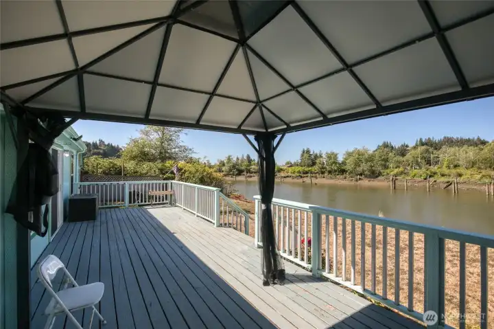 Motivated seller! 100 ft Hoquiam river frontage. Fish out your back door. Open-concept, 3 bedroom, 1 3/4 bath with great kitchen and walk-in pantry. Oversized 12x40 ft deck with gazebo. Newer concrete parking can park 6 cars, aluminum wheelchair ramp, and full RV hookup. Two 10x12 sheds w/lofts--front one is finished w/power and flooring. Smaller shed has lean-to for wood and mower storage. Newer wood stove and fresh interior/exterior paint are just a few of the upgrades. The private backyard is fenced and gated, featuring 4 raised garden beds, fruit trees, grape arbor, 2 golden chain trees, and windmill palm. Quiet seclusion with view out your back door. Only 5 minutes to town—peaceful and move-in ready! Assumable VA loan, ask for details.