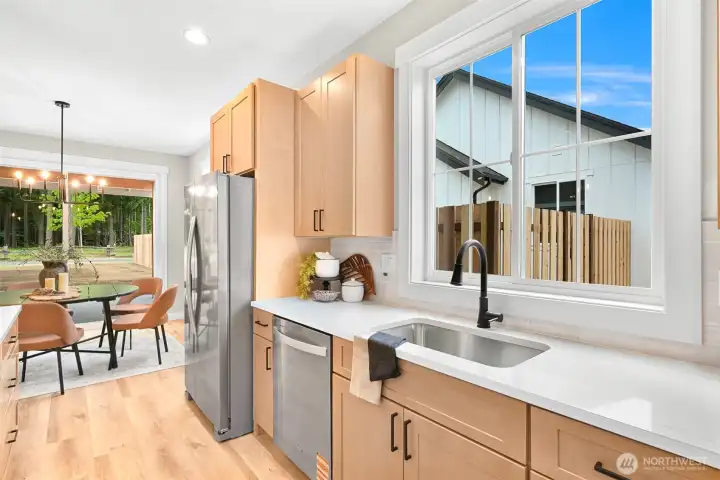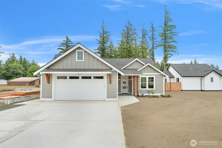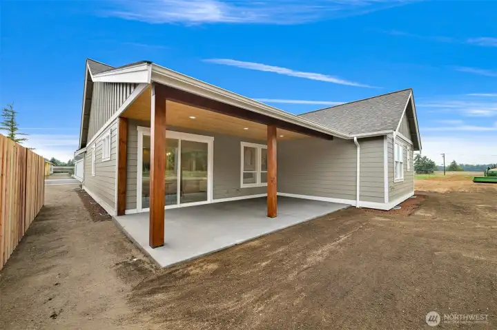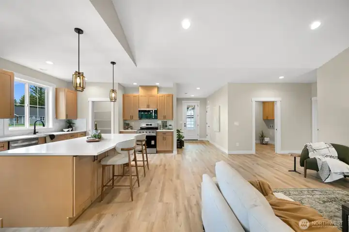 This stunning 4-bedroom, 1.75-bath home offers step-free access throughout, modern finishes, an open-concept layout, and a level spacious backyard. Enjoy vaulted ceilings and a cozy gas fireplace in the living room. The kitchen is both stylish and functional featuring quartz countertops, tiled backsplash, stainless steel appliances, a walk-in pantry and ample storage. The primary suite features a walk-in closet and a spa-inspired bathroom with a tiled shower and double vanity. Three additional bedrooms, a full bath, and a dedicated laundry room complete the interior. Step outside to a large, covered patio, perfect for relaxing or entertaining!