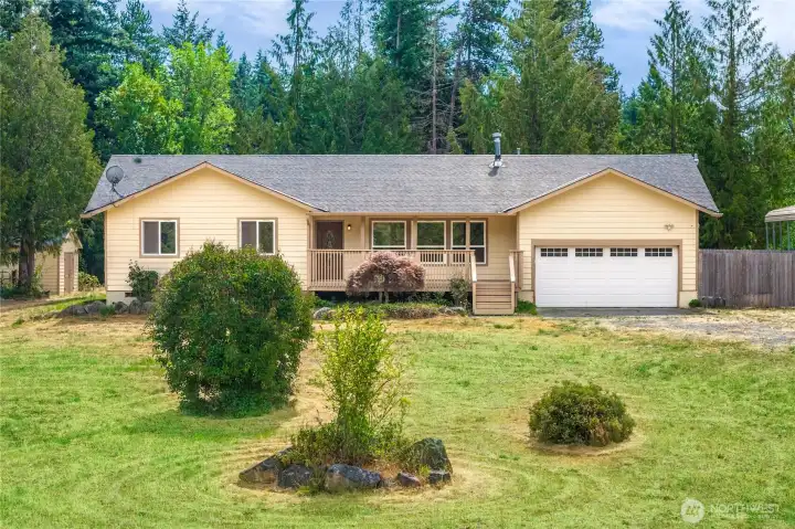 Welcome to this 3 bed 1.75 bath rambler nestled on 9.69 scenic park-like acres at the end of a long private driveway. It features a spacious layout w/ new flooring and newer paint. The kitchen is bright & inviting w/ newer appliances. French doors open to expansive rear patio, while large covered front porch offers a warm welcome. Add'l features include attached 2-car garage, detached HUGE 4-BAY SHOP w/ 400amp & RV parking, large carport, circular driveway with space for semi-truck and trailer, & pump house w/ extra storage. Enjoy peace and privacy on well-maintained grounds featuring walking paths, a seasonal creek & pond with ducks, fruit trees, & garden space—perfect for multi-generational living, home-based business, or private retreat.