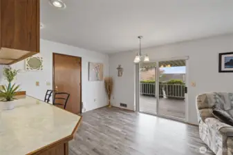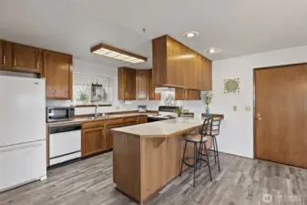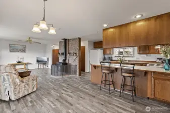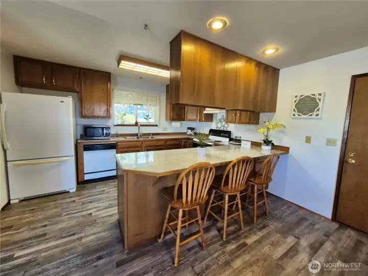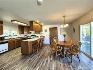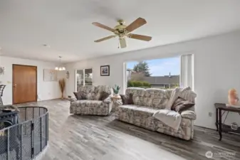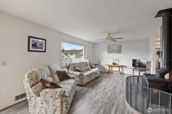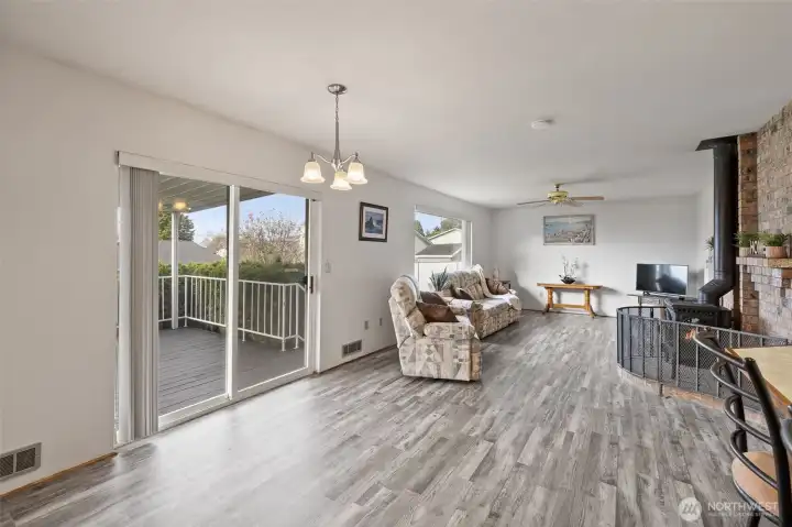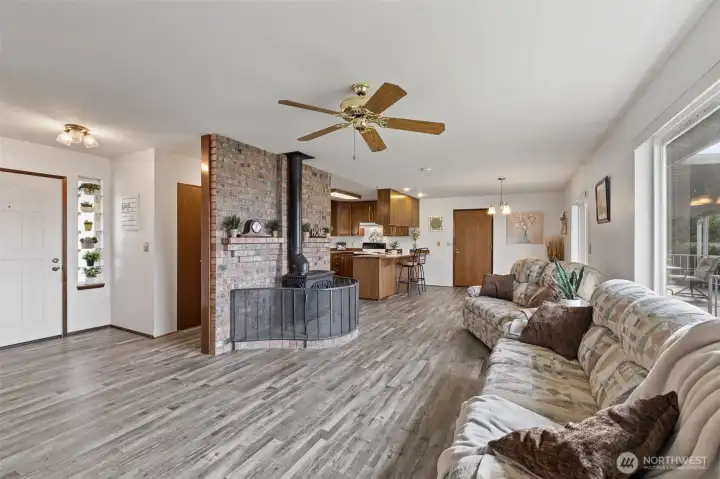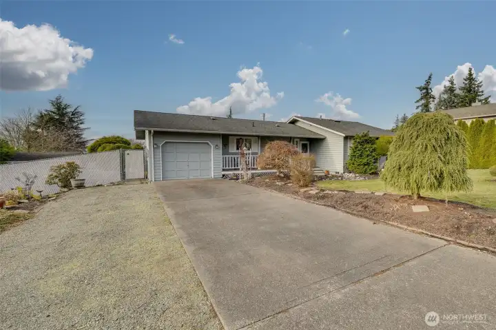 Wonderful Stanwood rambler on big 10,019 sq ft lot. New luxury vinyl laminate flooring in kitchen, dining rm, living rm, entry & bathrooms. New carpet in all three bedrooms. Fresh paint in main living areas and bedroom. Gas stove in living room w/partial sound view & in dining rm, Primary & off huge, covered deck. Great home for entertaining w/plenty of parking. Primary suite W/full bath & large walk-in closet. Fully fenced back yard w/outbuilding. Beautifully landscaped w/waterfall water feature in the back. Potential for additional parking in back for RV. Close to schools, shopping, restaurants & clinics etc. This price includes new roof, kitchen appliances & garage doors. Crawl space is done & new hot water tank too! So much for the $!
