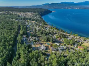 Enjoy coastal living in this Cape George Colony home, offering one-level living and beautiful water and mountain views. Known for its stunning sunsets, the home is filled with natural light, with many rooms and outdoor spaces designed to take in the surrounding scenery. The main living area features vaulted ceilings, wide-plank hickory floors, a wood stove, and a built-in window seat. The kitchen includes soapstone countertops, a propane cooktop, and a spacious walk-in pantry. The primary suite offers cedar-lined closets, and both bathrooms feature heated tile floors. Additional highlights include a heated 2-car garage, ideal for storage or workspace. Cape George amenities include marina access, indoor pool and spa, fitness center, clubhouse, and pickleball courts. This home is being sold As IS. The price reflects a soon to be needed septic system replacement, offering a great opportunity to bring your vision and build equity in a highly desirable coastal community.