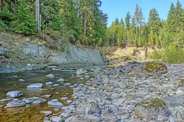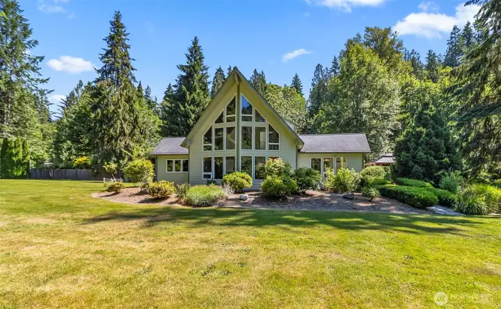 This exceptional property provides privacy, seclusion, beautiful waterfront and a gorgeous home. The tiled entry welcomes you to open spaces with vaulted ceilings, full wall of windows & gas fireplace in the fantastic living room. Holiday sized dining room opens to the covered patio w/hot tub. The kitchen is bright, open and includes quality appliances & cabinetry, gas range & breakfast bar. Two bedrooms on the main level include the primary with luxurious bath and walk-in closet. A second primary suite on the upper level also has a full bath, walk-in closet & balcony with a view of the water. Welcome natural light throughout & the view is inspiring. Level, sunny 2.3 acre lot with mature landscaping, firepit, horseshoes, generous parking.