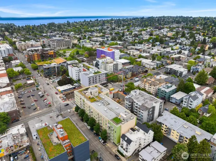 Light-filled corner unit with 9' ceilings in a prime Ballard location with sweeping roof top views of Salmon Bay and stunning sunsets from the 5th floor. Thoughtfully upgraded with white kitchen countertops, new appliances, custom shelving and designer fixtures throughout. The open layout includes a spacious entry and versatile den, perfect for a home office or reading nook. Two garage parking spots (one EV-capable) and a large storage unit add rare convenience. Enjoy top-tier building amenities: rooftop deck, concierge, fitness center, pet wash, bike storage, and dog run. Just steps to shops, restaurants, grocery stores, transit, Burke-Gilman Trail & the Ballard Farmers Market. City living with comfort, style, and breathtaking views.