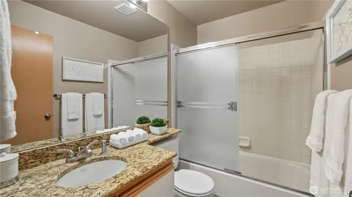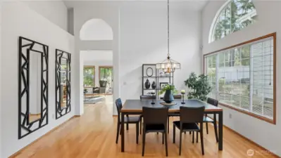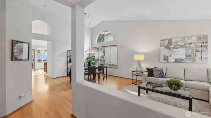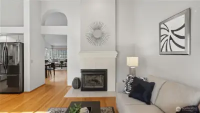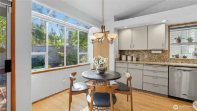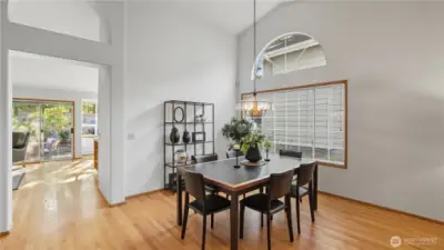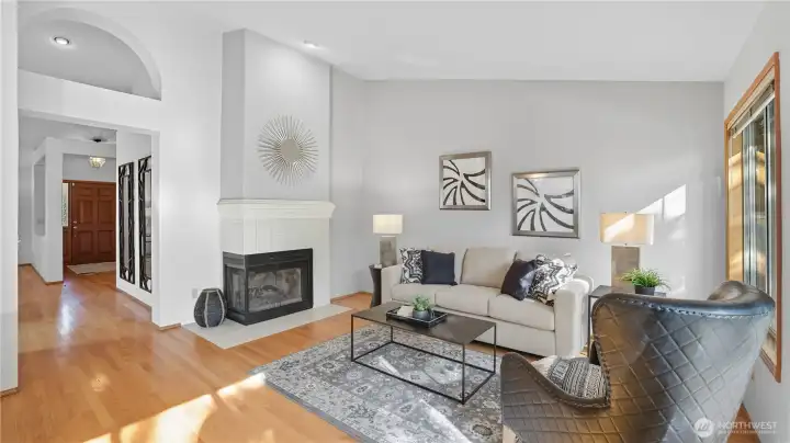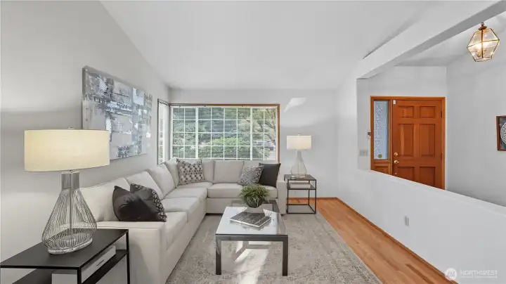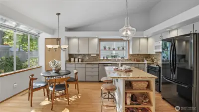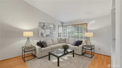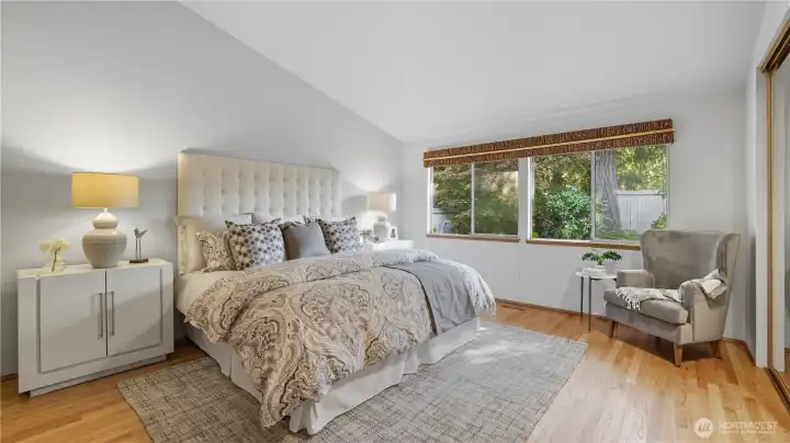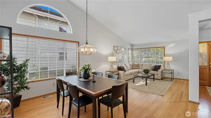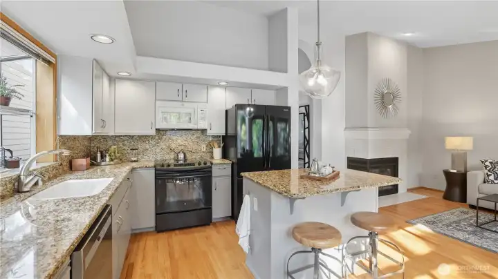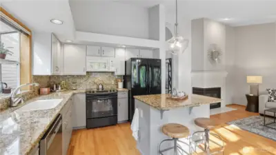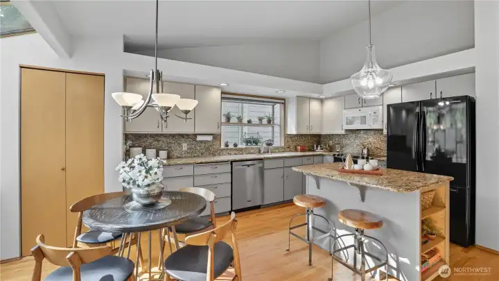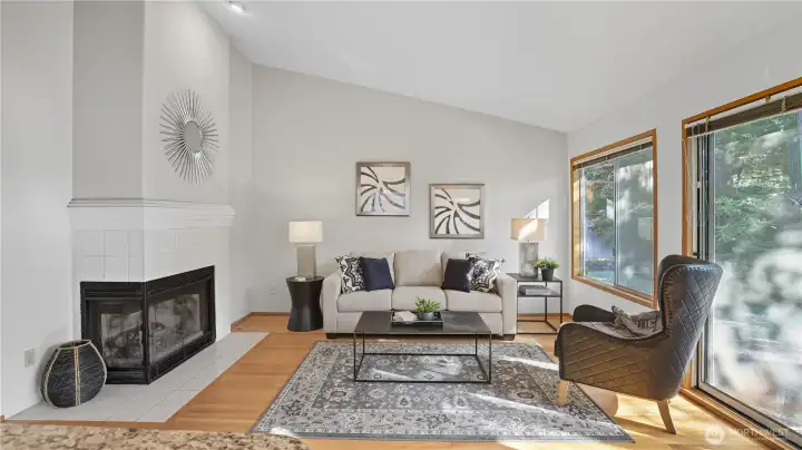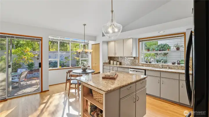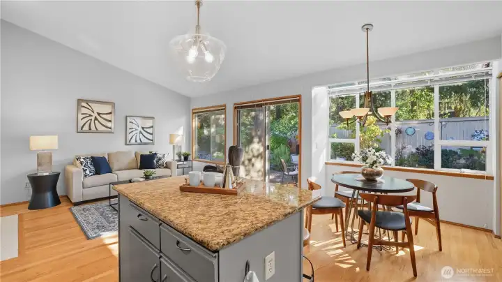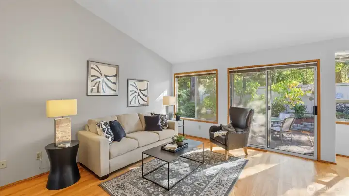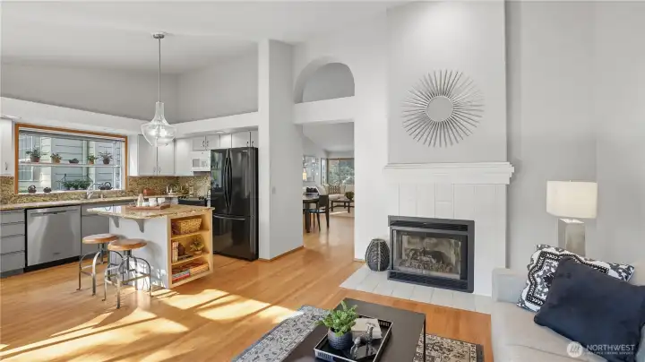 Sought after single level home in Klahanie is walking distance to Klahanie's tremendous amenities. Hardwood floors through much of the home. Vaulted ceilings & large windows in the living room & dining room. Nicely updated kitchen is open & airy & offers hardwood floors, granite counter tops, garden window, pantry, center island & eating nook. The family room has a tall ceiling & gas log FP. Spacious primary bedroom w/vaulted ceiling and primary bath with hardwood floors, granite counter tops, tall ceiling & mirrored clst.. 2 addtl bedrooms & updated full hall bath. The sunny backyard is mostly fenced. The patio is large, and the backyard grass is synthetic. Features include a new furnace (Jan 2025), new A/C (Sept 2021), and Leaf Guard sys