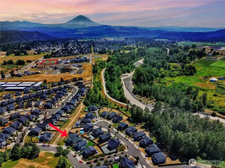 Beautiful modern Craftsman with space, style, and stunning views! This 5-bed home features a bright open-concept layout that connects the kitchen, dining, and living areas, perfect for everyday living. The kitchen offers modern finishes, generous counter space, and excellent functionality. The spacious primary suite boasts a 5-piece bath and walk-in closet. Upstairs you'll find 4 large bedrooms and a full bath. The 5th bedroom is on the 3rd floor, a versatile flex space ideal for guests, work, or play. Enjoy year-round comfort with A/C, a fully fenced yard, covered patio, and breathtaking mountain views. A private gate opens to a path to the river, your own slice of PNW lifestyle. All just moments from the sought-after Orting Trail.