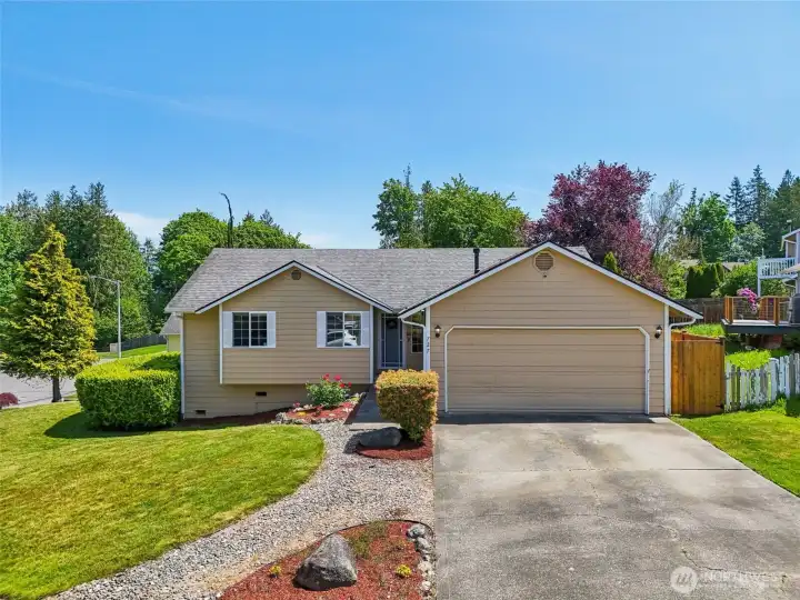 Welcome home to this beautifully updated three-bedroom, one and three-quarter bath rambler on a spacious corner lot in the heart of Lake Stevens! Just minutes from shopping, recreation, and Highway 9 for an easy commute. Inside, you’ll find open-concept living with vaulted ceilings, newer appliances, a stylishly refreshed kitchen, and modernized bathrooms. The primary bedroom offers its own ensuite, and two additional bedrooms provide space for guests or a home office. From the dining area, a slider leads to a small deck—perfect for BBQing. The generous two-car garage, along with ample driveway parking, offers plenty of room for storage, hobbies, or all your outdoor gear.
