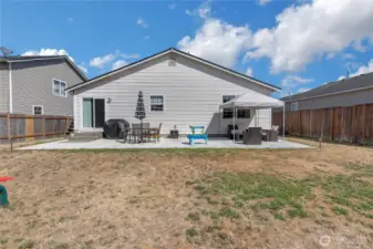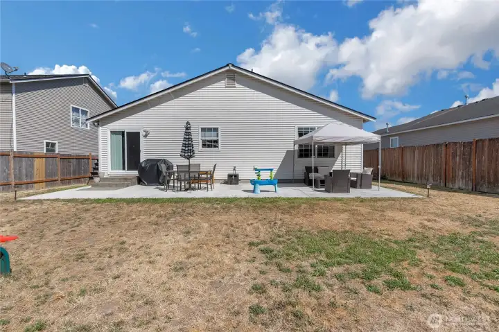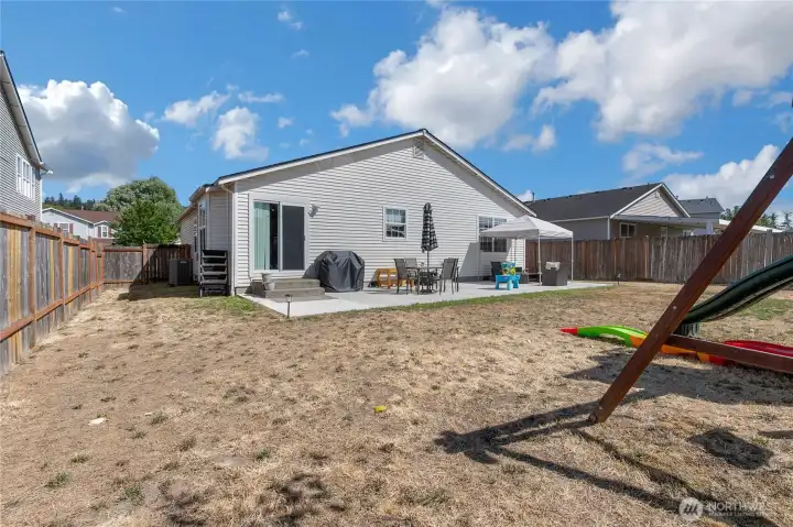 Welcome Home to this spacious rambler in Orting's Village Green. Large open living space with laminate hardwood floors includes living room, dining room and kitchen with a big island, tons of counterspace and walk in pantry. Primary bedroom with ensuite bathroom and walk in closet. Two additional bedrooms with conveniently located main bathroom. Huge backyard with an oversized patio for outdoor entertaining. Air conditioning for keeping cool on warm summer days. A brand new roof was installed in 2024. Community park just down the block, walking distance to the Orting Trail and downtown Orting is nearby. Easy access to Hwy 410, 512 and 167 for easy commuting.