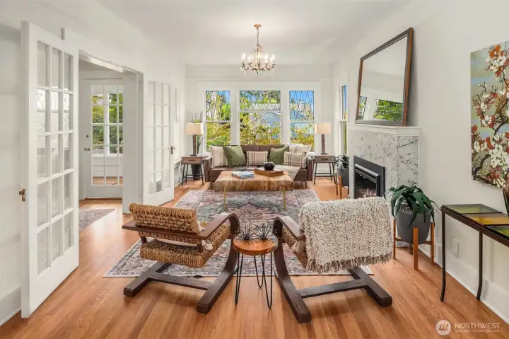 1st time on in 34 yrs! This 2025 remdeld foundation-up period QA Craftsman is off the St for added lite, privacy & views steps from Rodgers Park, Coe elem, gourmet restrnts, bakeries & boutiques in this sought after oasis just minutes walk to Amazon, SLU, Climate Pledge and worlds tech core w/out sacrificing prvcy! Sunporch open to a frml entry offers gleaming true fir/oak flrs under soaring ceilings thru the LR w/its designer marble FP, open DR unfolds into a new gourmet kit befitting true epicurean standards w/hand-crftd cabs, solid slab cntrs, stone flrs, centerpiece island & top SS appls evoking your inner Anthony Bourdain! Frnch drs extend the living space to a dining deck! New designer bths, roof, sewer, heat a/c & guest suite/4th Br