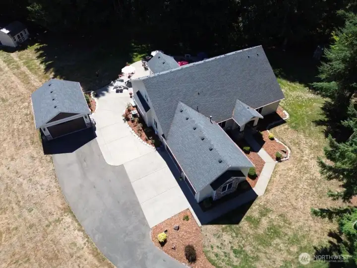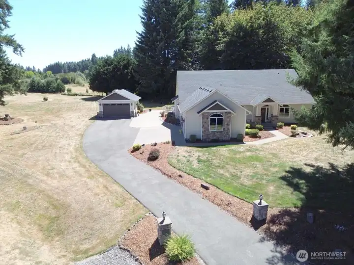 Tranquil Oasis tucked away peaceful on the end cul-de-sac, stunning 3,354 SF custom on 2.5 park-like acres offers a rare blend of privacy, elegance & everyday comfort. Welcoming drive, manicured landscaping, garden shed, gazebo & charming, covered entry set the tone for something special. Interior soaring 20+ foot ceilings, sun-filled rooms, and a seamless flow perfect for both intimate living and grand entertaining, & whole house generator. Main floor features a formal LR, great room, luxurious primary suite with a spa-inspired 5-piece bath, jetted soaking tub, and walk-in closet. Two additional bedrooms share a Jack & Jill bath, while a versatile den/office easily converts to a guest rm. Engineered hardwood & tile floors w/timeless style.