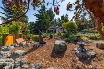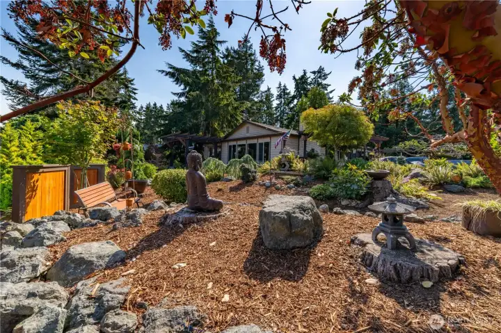 An iconic Port Angeles retreat where timeless design meets beautifully curated grounds. This 2,100+ sqft single-level home offers two spacious primary suites, each w/a private en-suite, generous closets, & direct access to gardens. Floor-to-ceiling windows in the formal LR fill the space w/light & frame views of the landscaping. Formal dining provides an elegant space for entertaining & the well-equipped kitchen features a new range, microwave/hood, & dishwasher, opening to a cozy den w/access to the fully fenced backyard & patio. The low-maintenance gardens include 50+ Japanese maples, 30+ peonies, dry riverbeds, statues, & pergolas. 450+ sqft garage offers 2-car parking + storage. Easy access to the Olympic Discovery Trail & water views.