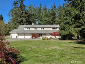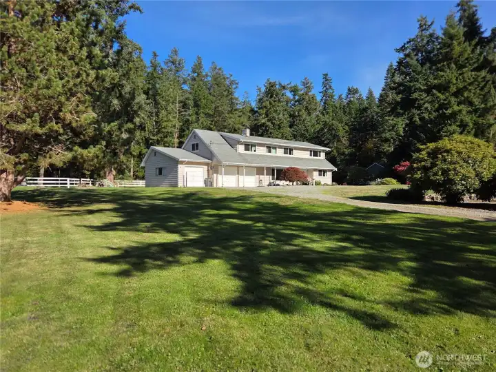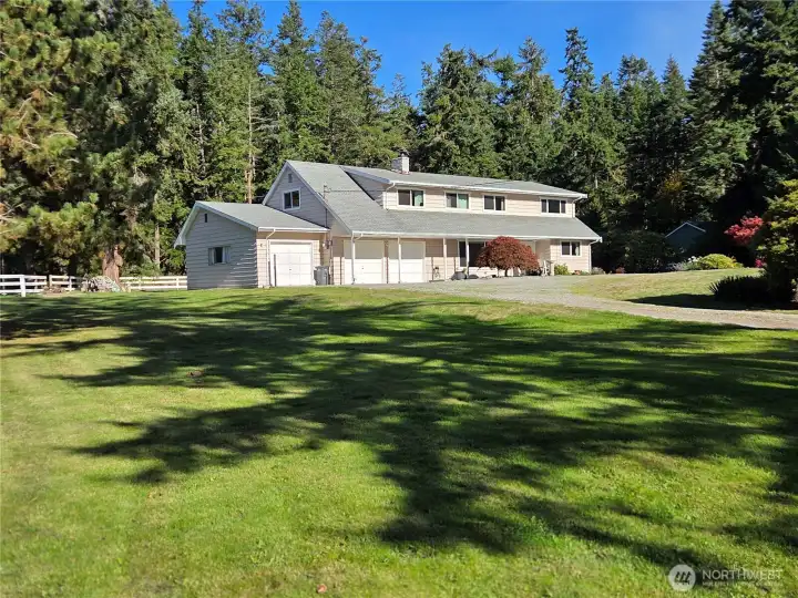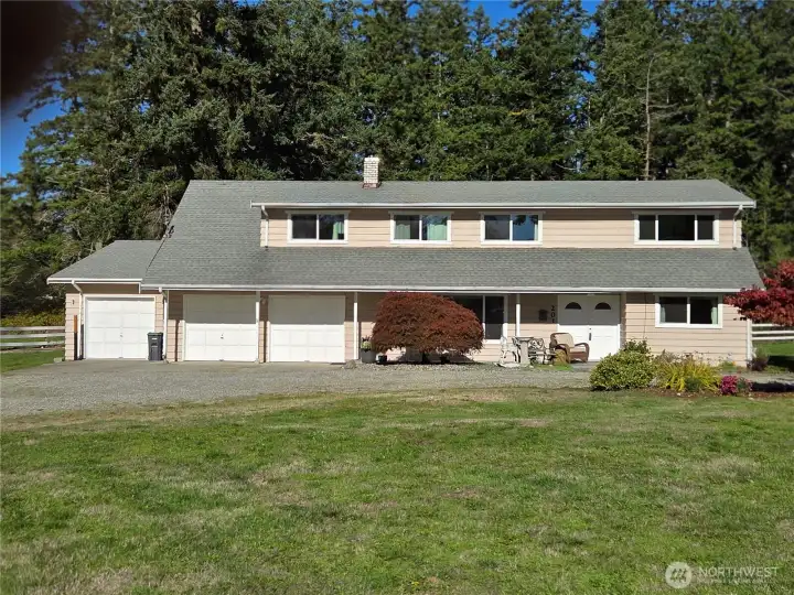 PRICE IMPROVEMENT! Discover your dream oasis on this fully fenced, sunny, expansive level acreage, perfectly positioned near town, base, parks, and beaches. This beautifully maintained home boasts lush lawns, a charming 2-stall stable and paddock for your animals, garden plots, a circular drive, a wooded area for privacy, plus fruit trees! Inside, enjoy modern upgrades like a newer furnace, fridge, stove, dishwasher, wood stove, and hot tub, and a roomy and flexible floor plan. The spacious 3-car garage features epoxy flooring and versatile dual exits. Just minutes from everything yet offering private tranquility, this inviting retreat is ready for your personal touches. Watch the video to see more, your forever home awaits!