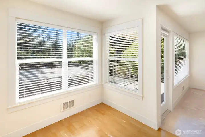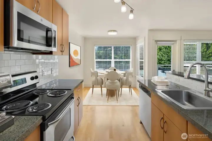 Surrounded by mature evergreens, this top-floor Edmonds condo feels like a private retreat. This 880 sq ft 1BD/1BA + den home offers a bright, open layout with exceptional privacy- living like an end unit with only one shared wall. Southern exposure fills the space with natural light and highlights peaceful treetop views. The versatile den is perfect for a 2nd bedroom, home office, additional living space, or creative retreat. Modern comforts include granite counters, SS appliances, in-unit W/D, and dedicated secure storage. Enjoy resort-style amenities: sparkling outdoor pool, clubhouse, fully-equipped fitness room, elevator, and lush landscaped grounds. Perfectly situated near I-5, Hwy 99, and just minutes from downtown Edmonds shops, restaurants, and waterfront. A thoughtful blend of privacy, natural light, and location—Edmonds living at its best!