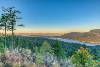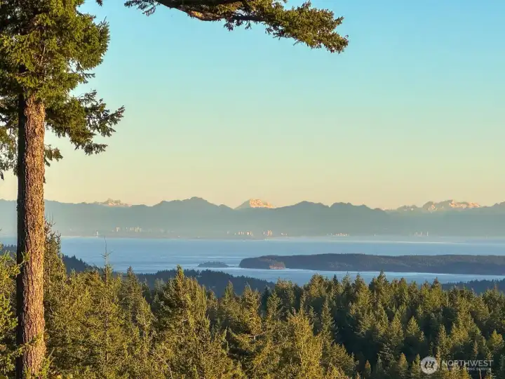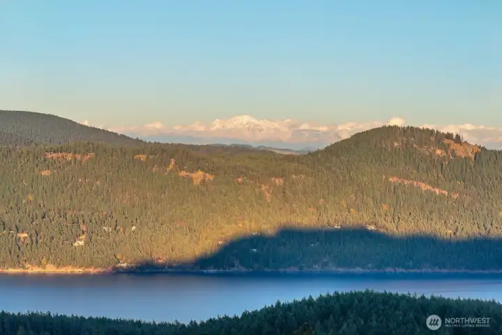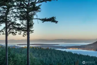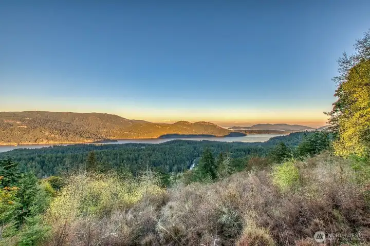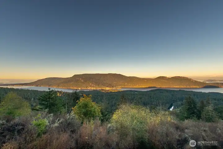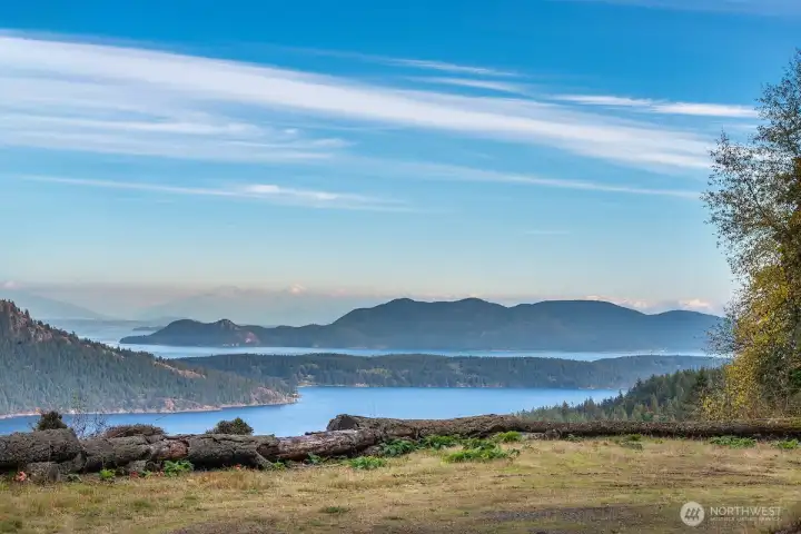 Panoramic 180 degree views from Cypress Island in the southeast, past snow-capped Mt. Baker above East Sound and Rosario, with Canadian Cascades, night-lit ski slopes and cities as a backdrop. One of 11 lots within the 232 acre Spring Hill Wildlife Sanctuary, this 25 acre site has plans ready for construction of a custom 3800 sf home w/ all rooms having views of Mt. Baker & Mt. Constitution. A full set of permitted plans by Vandervort Architects (use to be negotiated directly w/ the architect), an active building permit, approved Fire Marshall plan, septic design/permit, wetlands study, geological survey, private well, electricity & irrigation. End of the road location provides complete privacy. Spring Hill is a gated community.