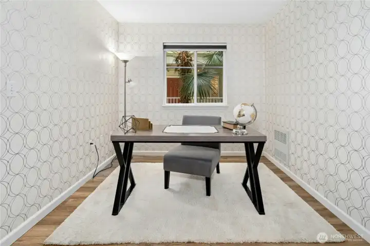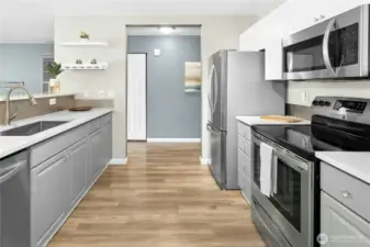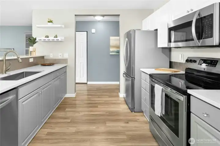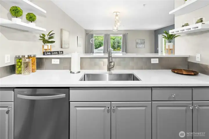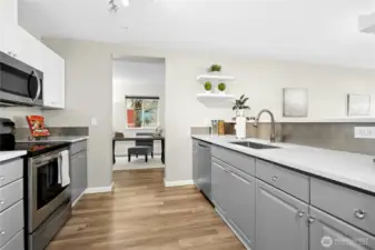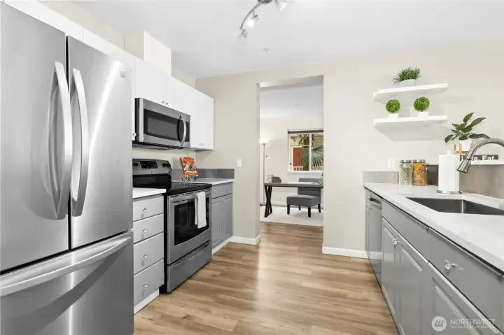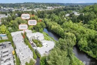 Enjoy scenic riverfront living in this 1,252 sq ft two-bedroom + office, two-bath condo at Riverfront Landing, built in 1999. The open-concept layout features a modern kitchen with quartz countertops, stainless-steel appliances, and generous cabinetry for storage. A bright living area opens to a private deck overlooking the Sammamish River. The primary suite offers dual sinks, a large glass shower, and walk-in closet with built-ins. Two secure underground parking stalls and dedicated kayak storage add convenience. Residents enjoy access to the Sammamish River Trail and private shoreline launch. Only 0.4 mi to the Park at Bothell Landing, nearby dining, and easy routes to I-405 and SR-522 for access to Seattle, Redmond and Kirkland.