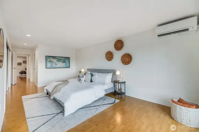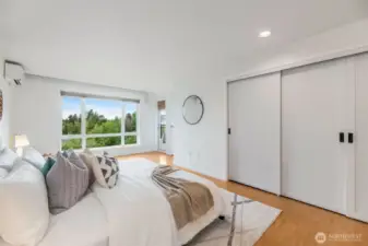 Modern living in the heart of Bellevue. MAIN LEVEL - CORNER UNIT 2 bed/1.75 bath unit within 20 unit boutique building located on a tree-lined street. Walk Score 91! Unit features a wood burning fireplace, dedicated laundry room and a balcony with downtown western views. Recently installed mini-splits in living room as well as primary bedroom. Completely renovated in 2012. Handicap accessible. 2 covered parking spaces + dedicated storage room. Well managed building, elevator access, secure entry and ample guest parking. Central to transit & light rail, Bellevue's downtown park & Meydenbauers waterfront. Currently under the rental cap and unit may be rented out!!