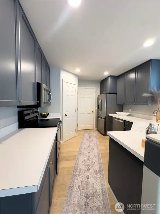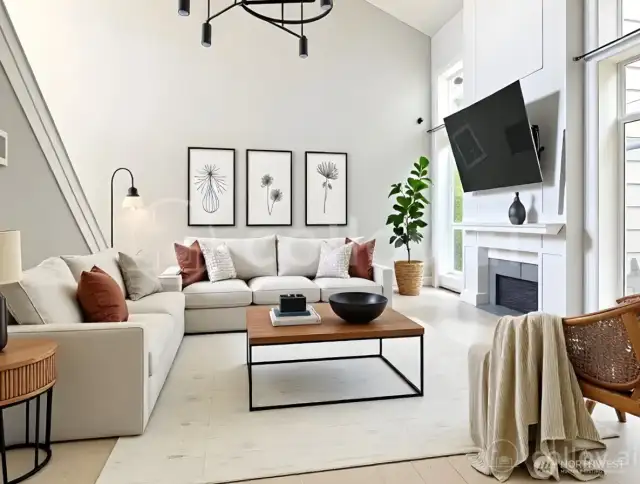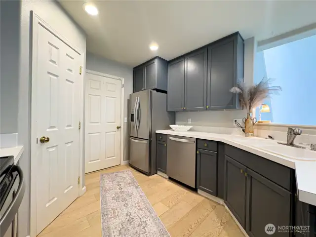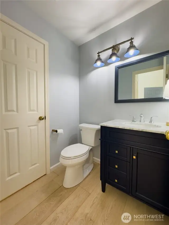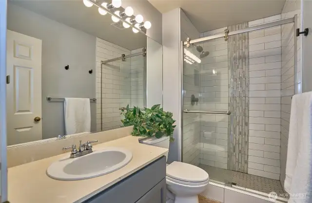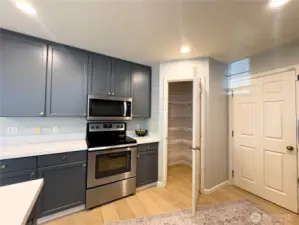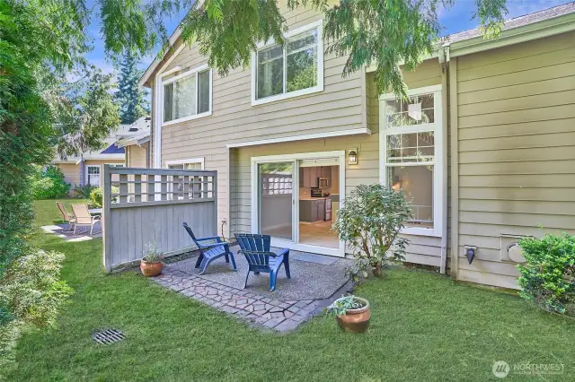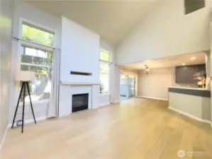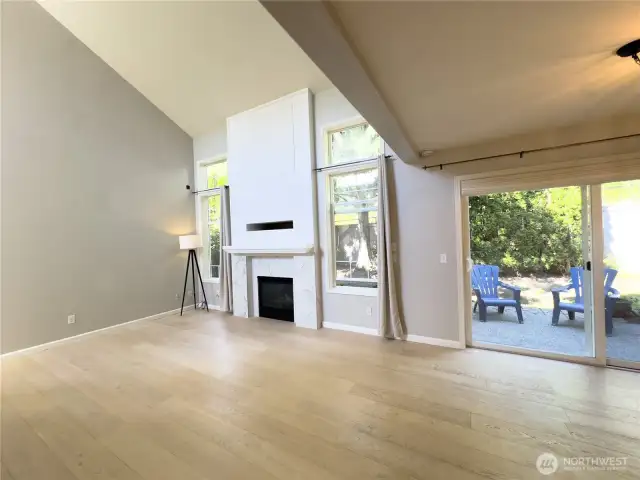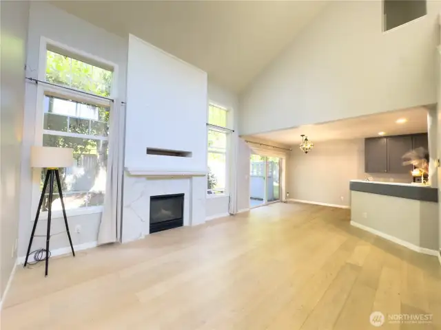 Truly a wonderfully bright and airy home with perfect floor plan. Main floor European oak hardwood floors lead you through to the main 3rd bed or den w/ closet in half bath. Large windows overlooking the garden. Spacious family room with soaring ceilings, and cozy gas fireplace lead you to dining area and updated kitchen. Tons of cabinets and counter space, and large spacious pantry. Walk out to the private patio that you can fence in. Open staircase leads you upstairs where you will find two beds with en-suite and double closets. Primary has remodeled bath with walk in shower, walk in closet. Upstairs bedrooms have plush gorgeous carpet. Enjoy quiet ambiance of this Gated community!