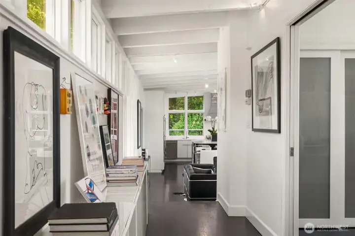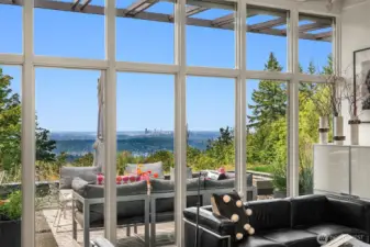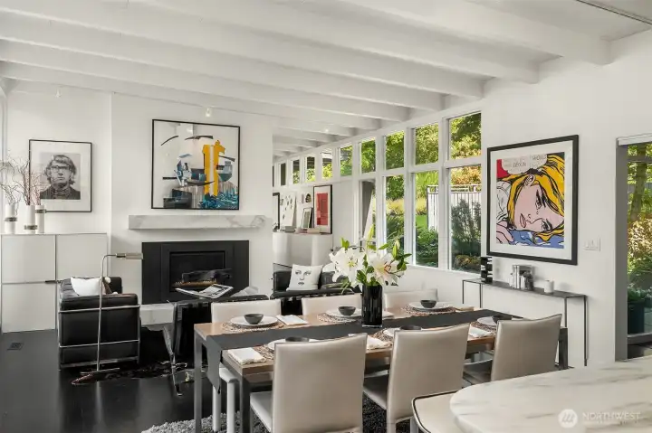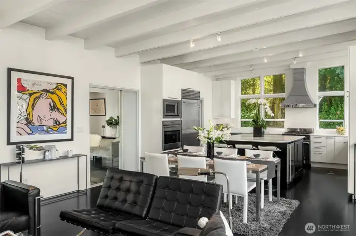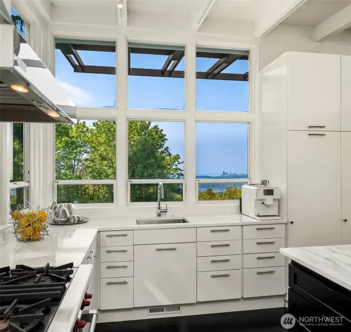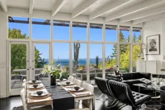 Mid-Century Modern Designed by Roland Terry This rare architectural one level home is located in the secluded Hilltop community founded by renowned UW architects with the intent of preserving original design & character Situated on a private lot of 31,500 sq ft, west facing, spectacular views of Lake Washington, Puget Sound, downtown Seattle & Olympic Mtns This home highlights iconic mid-century modern with walls of glass, hardwoods & polished concrete floors that blend indoor & outdoor living Thoughtfully updated, including plumbing, electrical, windows Remodeled kitchen featuring Calacatta marble island, quartz countertops & luxury stainless-steel appliances. Landscape with lush native plants, private setting & serene outdoor patios