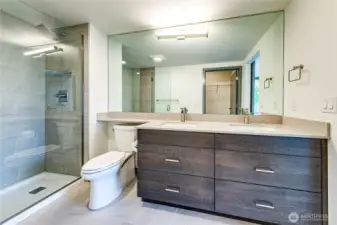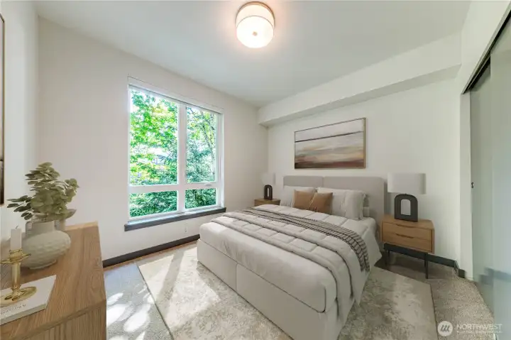 Live in style at JADE, Totem Lake's premier urban community! Explore this gorgeous & bright two-bedroom corner residence featuring wide plank hardwood floors, waterfall edge quartz countertop, & stainless-steel Bosch appliances. This unit features a large outdoor space that only a few units have! 9 ft ceilings, high-end modern interior finishes, expansive windows, and a den large enough to fit a queen-sized bed or beautiful home office. Well-managed HOA with low dues and no rental cap. Enjoy resort-style amenities: clubroom, gym, rooftop deck, on site concierge, package lockers, storage, guest parking, dog washing area, bike storage, 2 garage spaces & EV charging. Steps to Totem Lake Village, parks & transit center. Award-winning Schools.