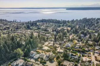 This stunning open-concept home perfectly blends modern elegance w/natural beauty, offering breathtaking panoramic views of the sound & Olympic Mountains. Expansive floor-to-ceiling windows flood the space w/natural light, showcasing lush evergreens & tranquil waters beyond. Vaulted ceilings & soft neutral tones enhance the airy atmosphere, while warm hardwood floors provide a cozy contrast. A sleek fireplace w/ a white brick surround adds charm, complemented by tasteful greenery & contemporary decor. The dining area, set against a scenic backdrop, invites memorable gatherings, while the adjoining deck & hot tub offer seamless indoor-outdoor living. This home is a perfect retreat for those who appreciate sophistication & nature’s splendor.