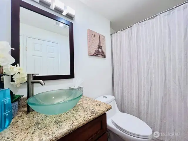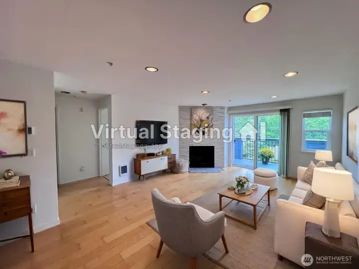 Top-Floor Updated 2BR/1.75BA Regentwood Condo! Refreshed w/hrdwd flrs, fresh paint, & upgraded kitchen w/SS appls, granite counters, glass tile backsplash, breakfast bar, & under-sink water filter. Open living/dining w/wood-burning fireplace opens to full-length deck w/territorial views—perfect for morning coffee. Primary suite has mirrored closets, private balcony, & ensuite bath; 2nd bdrm has 2 closets. Updates incl new windows, sliders, & grg door. Highlights: top-floor privacy, 2 parking spaces (grg + assigned), newer W/D, water heater, & appls. HOA covers W/S/G & ext. Community clubhouse, gym, & sports court. In acclaimed Northshore SD w/easy access to 522, 405, Kirkland, UW Bothell, Totem Lake, & Burke-Gilman Trail. No rental cap!