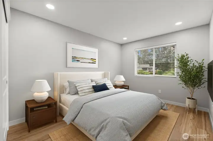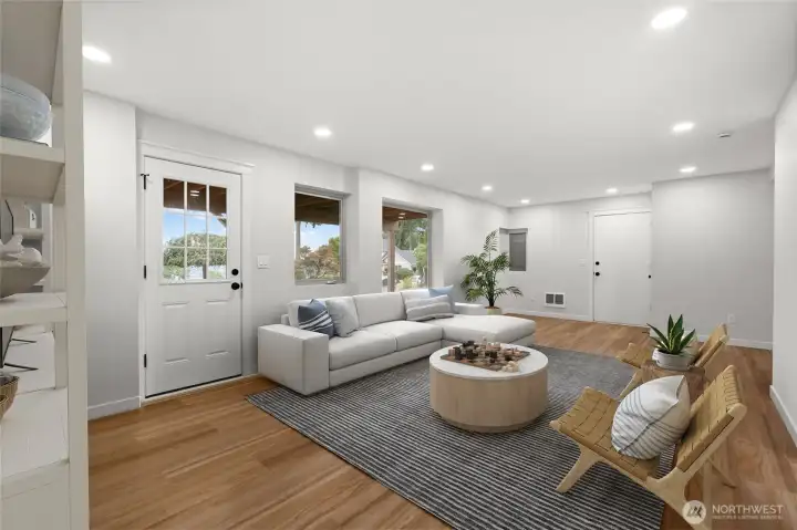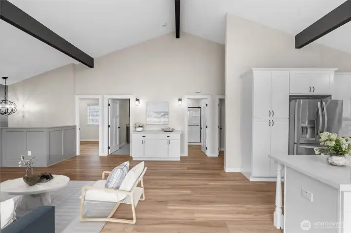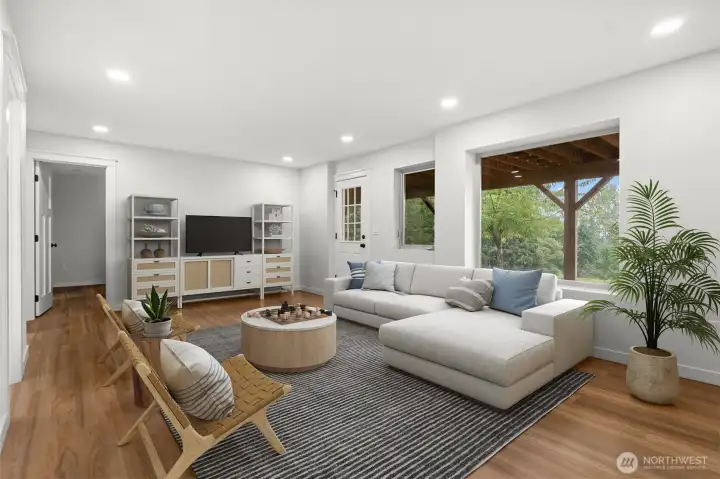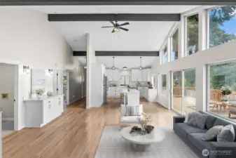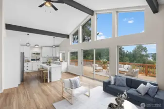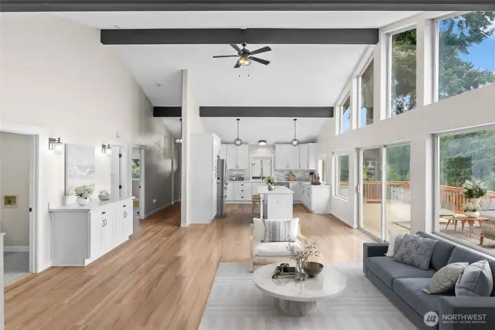Sweeping views of Mount Rainier and Puget Sound from a reimagined Fox Island home on a private, tree-lined corner lot. Vaulted ceilings with exposed timber beams and floor-to-ceiling windows fill the open great room with natural light and water views. A wraparound entertainer's deck with retractable awning extends the living space outdoors — the kind of home where the view becomes part of the room. A stunning kitchen anchors the main level — quartz island, white shaker cabinetry, tile backsplash, stainless appliances, and matte black hardware under soaring beamed ceilings. The primary suite opens directly to the deck through a sliding glass door with a fully updated en-suite bath. Downstairs, a finished walk-out level with its own entry offers a bedroom, full bath, and laundry — ideal as a guest suite or home office. Every detail has been handled — from the covered timber-frame carport and front porch to the fresh landscaping across a quarter acre. All that's left is the life out here: Rainier at sunrise, the Sound through every window, and nowhere you'd rather be!