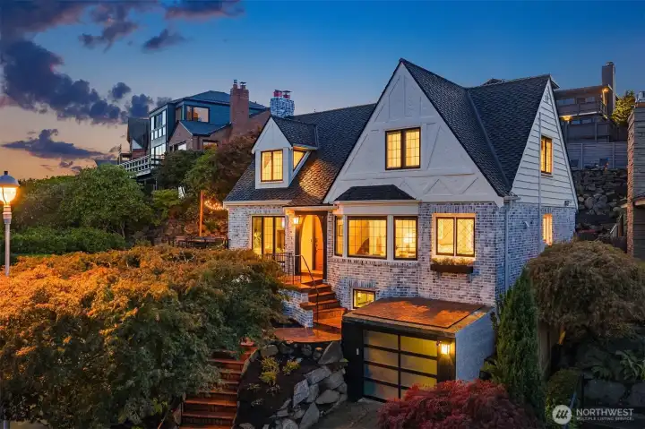 Perched high on Magnolia’s coveted west hill with underground wiring, this storybook Tudor delivers jaw-dropping Seattle views—Cascades and Mt. Rainier by day, city lights by night. Stylishly updated with central A/C, new roof, exterior paint and lighting, designer fixtures, and smart Lutron lighting throughout. The lower level WOWS with a speakeasy vibe and remodeled bath, laundry and mudroom, while upstairs offers three bedrooms with two new luxe ¾ baths with West Elm fixtures. Main floor blends period charm with an open kitchen/dining, sitting area, and generous living spaces. Outside, new Trex decking, saltwater hot tub, and a sprawling street-to-alley lot that has been leveled and lit up! Rare 3-car garage seals the deal.