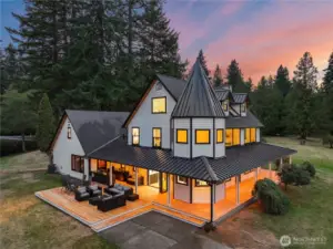Remodeled Storybook Craftsman w/ high-end finishes & original gorgeous hardwoods throughout. Features a new gable roof w/ metal accents, heated tile floors, mood lighting, & chef’s kitchen w/Forno appliances, custom wine bar, 8-ft accordion doors to a large deck & outdoor kitchen. Two luxe en-suites with soaking tubs overlook a pond w/ fountains. Top-level suite includes 5 closets, balcony skylight & smart glass door. Media room w/ acoustic paneling, flex space w/ kitchenette & ¾ bath. 2,600 SQFT shop w/ 4 bay doors + loft, detached garage w/ gym. Fruit tree orchard, indoor sauna & hot tub in gazebo. Wraparound porch on 5 usable acres—ideal for horses/mini farm. Epic views from every window, incl. Mt Baker. Minutes to I-5 & all amenities!